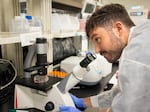 Conception's chief scientific officer, Pablo Hurtado, examines very early primordial germ cells under a microscope in a company lab in Berkeley, California.