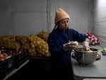 In a chilly storeroom piled high with fall produce, Jimena Cordero is chopping up vegetables and fanning them out onto trays.
