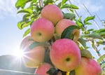 The sunlight glints across Sunflare apples ripening on a branch at WSU's research orchard near Wenatchee, Washington, in late summer 2024.