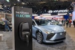 A Powering Michigan display about electric vehicles and charging is shown at the 2025 Detroit Auto Show on Jan. 10. The Biden administration promoted electric vehicles through a range of policies, which the Trump administration is in the process of reversing.