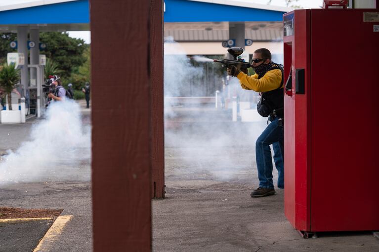 Throughout the day, members of each side exchanged words and debated each other, but no notable violence had taken place for the first few hours of the gatherings. That changed just after 4 p.m., as the Proud Boys and anti-fascists ran along 122nd Avenue, exchanging paint balls and bear mace. Some people in the crowd threw mortar fireworks near a Chevron gas station, which had to close.