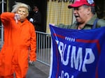 Mike Hisey, left, wearing a mask of former President Trump in a prison uniform while Mariano Laboy, right, holds a Trump reelection sign outside of Trump Tower on Tuesday, March 21, 2023, in New York.