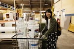 "I think this place is very friendly for students who don't have so much funding and support," said film student Oyster Liao. She was pushing a metal shopping cart piled high with pots of paint around EcoSet's warehouse. "And I like that we don't have to waste so much."