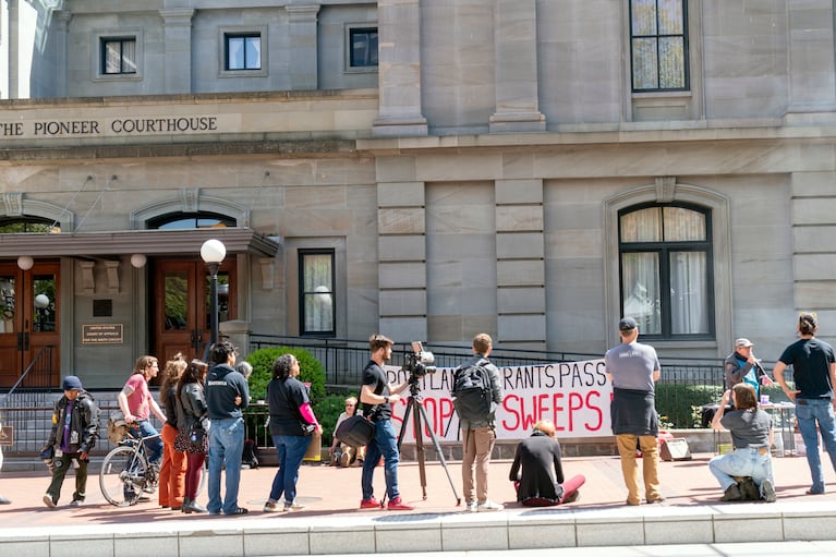 Dozens of people gathered in downtown Portland Monday afternoon to protest a United States Supreme Court case that could reshape how cities across the country regulate unsheltered homelessness.