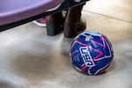 A partially deflated football lies under some chair at a Casa Alitas facility in Tucson, Arizona on Tuesday, March 26, 2024.
