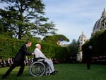 Pope Francis leaves evening prayers in the Vatican Gardens on June 7. The pope will meet this week with G7 leaders to talk about the ethics of artificial intelligence.