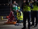 Coast Guard, ambulance staff, border agents and police escort asylum-seekers who landed on Dungeness beach in southern England. The asylum-seekers are taken to a station of the British charity, RNLI, for a medical check and search, before boarding a bus headed to Dover for processing, on Nov. 22, 2023.