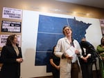 Vice President Harris listens as Dr. Sarah Traxler speaks during a visit to a Planned Parenthood clinic in Saint Paul, Minn., on March 14, 2024.