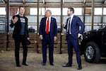 From left: Elon Musk, Republican presidential nominee Donald Trump and his running mate, Sen. JD Vance, talk to reporters backstage during a campaign rally on Oct. 5 in Butler, Pa.