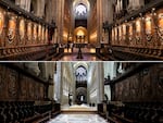 The choir stalls of Notre Dame on June 26, 2018 (top) and on Nov. 29, 2024 (bottom).