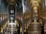 The nave of Notre Dame Cathedral in Paris on Nov. 29, 2024 (right) and on June 28, 2017 (left).