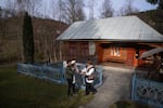 Volodymyr Sinitovych, director of the Hutsul Theater, greets his son and grandchild outside the small museum in Krasnoillya, where the history of Hutsul theater is documented and sometimes performed.