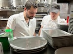 Grill cook Zachary Hooper, left, and sauté station cook Sean Lamberton review an order.