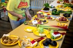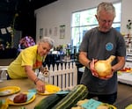 An Oregon State Fair volunteer attaches ribbons to award-winning vegetables in Salem, Ore., Aug. 27, 2025. For some, the Oregon State Fair competitions are a tradition that spans over multiple generations, many people having memories of attending and competing with their grandparents.