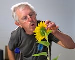 Long time Oregon State Fair floral competitor Larry Smith blows dust off of his sunflower entry in Salem, Ore., Aug. 27, 2025. Smith has been entering the State Fair’s Agriculture and Horticulture competitions since 1967, when he entered the competition alongside his grandmother.