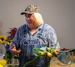 Rick Coufal, a participant in the Oregon State Fair floral competition, one of his wife’s flowers in a vase for judging in Salem, Ore., Aug. 27, 2025. For some, the Oregon State Fair competitions are a tradition that spans over multiple generations, many people having memories of attending and competing with their grandparents.
