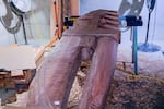Artist Shirod Younker uses a chisel to work an 8-foot-tall carving he's making out of western red cedar on Sep. 16, 2025 inside the basement of the new education pavilion opening at the Tryon Creek State Natural Area in Southwest Portland. Younker is Coos, Miluk and Umpqua, a citizen of the Coquille Indian Tribe and one of four Northwest Indigenous artists commissioned to create artwork inside the new space.