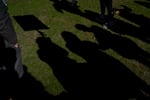 Protesters’ shadows are cast in Tom McCall Waterfront Park during the “No Kings 2.0” rally in Portland, Ore., on Saturday, Oct. 18, 2025.