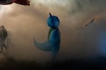 A protester in an inflatable axolotl costume wrapped in a Mexican flag navigates a cloud of tear gas. Officers continued using a barrage of chemical agents and munitions on the nonviolent protesters after the driveway was cleared.