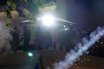 Federal officers deploy tear gas, flash-bangs and pepper balls on nonviolent protesters outside the U.S. Immigrations and Customs building in Portland, Ore., Oct. 18, 2025 in order to clear the driveway. About 500 people gathered outside the facility to continue protesting following the “No Kings 2.0” rally.