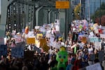 Protesters at the “No Kings” rally, marching to Tom McCall Waterfront Park in Portland, Ore., Oct. 18, 2025.