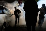 Protesters recover after gas is deployed at the U.S. Immigration and Customs Enforcement facility, Portland, Ore., Oct. 4, 2025.