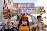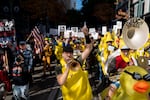 "No Kings 2.0" protesters pass by the Oregon State Capitol in Salem, Ore., Oct. 18, 2025.