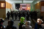 Officers confront protesters at the U.S. Immigration and Customs Enforcement facility, Portland, Ore., Oct. 4, 2025.
