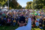 Crowds assemble at Elizabeth Caruthers Park in Portland, Ore., for a rally and march to the U.S. Immigration and Customs Enforcement facility, Oct. 4, 2025.