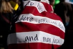 An Oliver Goldsmith quote that says, “Ill fares the land, to hastening ills a prey, where wealth accumulates and men decay,” is written on an American flag draped over a protester at the “No Kings 2.0” rally at McCall Waterfront Park in Portland, Ore., Oct. 18, 2025.
