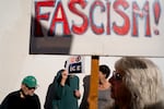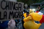 A man confronts a trio of people with signs that read “Honk if you love ICE” and “God Bless ICE,” outside of U.S. Immigration and Customs Enforcement facility in Portland, Ore., Oct. 4, 2024.