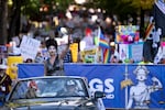 Caravaners pass by the Oregon State Capitol in Salem, Ore., Oct. 18, 2025. Two protests are happening Saturday in Salem — one is aligned with the national “No Kings 2.0” demonstrations, the other is organized by a group seeking to recall Democratic Oregon Gov. Tina Kotek.