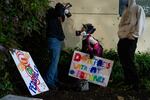 Skylor, a Charlie Kirk supporter who asked not to give his last name, signs a placard that will be sent to Erika Kirk in front of the Oregon State Capitol in Salem, Ore. on Saturday, Oct. 18, 2025.