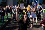 Angela Nichols, right, participates in the "No Kings 2.0" protest at the Oregon State Capitol in Salem, Ore., Oct. 18, 2025.