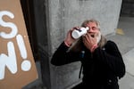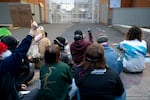 Demonstrators take a break from protesting at the “No Kings 2.0” rally in Portland, Ore., Oct. 18, 2025.