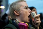 A person leads a chant outside of the ICE facility as rain begins to fall.