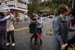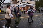 Jennifer Xiong dances in the street with the Bailando Afuera dancing group at the Immigration Customs and Enforcement building in Portland, Ore. on Saturday, Oct. 25, 2025. A crowd of about 100 gathered in front of the building to protest that afternoon.