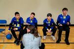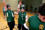 From left, Washington State School for the Blind Gold Lions teammates Eric Alaniz, captain Theo Burkhalter and Owen Boe break after the game.