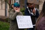 Eric Martin, left, and his mother, center, attend a rally for Paulino Martin in Beaverton, Ore., on Friday, Nov. 28, 2025. Martin, a resident of Beaverton for over 30 years, was arrested by Immigration and Customs Enforcement on Nov. 18.