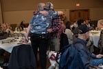 Northwest Battle Buddies graduate Rachel speaks with fellow graduate Mike and family members during the ceremony Vancouver, Wash., on Saturday, Nov. 21, 2025. The nonprofit matches veterans suffering from PTSD with service dogs during a five-week training course.