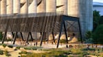 A rendering shows the 1803 Fund’s intended transformation of the former Louis Dreyfus Co. grain terminals on the Willamette River near the Oregon Convention Center and Moda Center in Portland, Ore. Source images by AD—WO, MALL and Wayside Studio; Rendering by The Light We Make