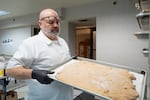 Diffendorfer pulls a sheet of baked gingerbread off the rack in his workshop at the hotel. Diffendorfer begins working on the display in September and spends 250 to 300 hours on the creation.