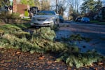 A car is crushed by a fallen tree on Northeast 24th Avenue on Wednesday, Dec. 17., 2025 in Portland.