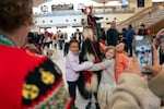 On Dec. 23, 14 dogs were joined by two service llamas, which have become a fixture of the December holiday markets at the airport. Travelers and airport staff lined up to get selfies with Panda and Beni — two 300-pound llamas dressed in holiday attire.