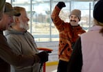 Dinko Plasto celebrates on Friday, Feb. 20, 2026, at The Pavilion ice skating rink in Bend, Ore. after learning that the Bend Curling Club received a $500,000 donation towards opening a dedicated facility in Central Oregon.