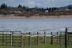The waters of the Onion Flats area of the Tualatin River National Wildlife Refuge is seen from a dirt road bordering the location of a proposed battery storage facility on March 14, 2026. The driveway leading into the wildlife preserve is where the new powerline would touch refuge land for about 19 feet as it crosses the road and driveway to connect to the Portland General Electric's substation nearby.