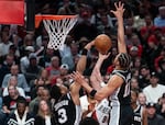 San Antonio Spurs defenders Keldon Johnson, left, and Carter Bryant defend Portland Trail Blazers guard Deni Avdija as he attempts to shoot during the third game in the Blazers’ first round playoff series against the Spurs at the Moda Center in Portland, Ore., on April 24, 2026. After losing, the Blazers now trail one game to two in the series.