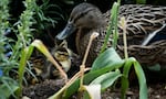 Rosie with her freshly hatched chicks, at the RoseVilla retirement community in Portland, Ore. on April 27, 2026. The duck made her nest in a third floor planter at the facility and the seniors watched over her and helped the ducklings to the pond after the hatch.