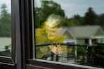 Penny Naumoff, left, observes the duck that has been nesting on her porch for weeks at the RoseVilla retirement community in Portland, Ore. on April 27, 2026.