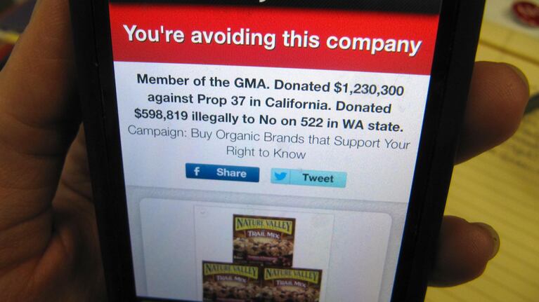 My co-worker's Nature Valley granola bars are made by General Mills, which is a member of the Grocery Manufacturers Association. When I scanned the bar code on the box, I was told that I am avoiding General Mills because the association gave $1.2 million to the campaign that fought against California's GMO labeling measure Proposition 37. And because the app says, the association donated "illegally" to the campaign opposing the GMO labeling initiative 522 in Washington.